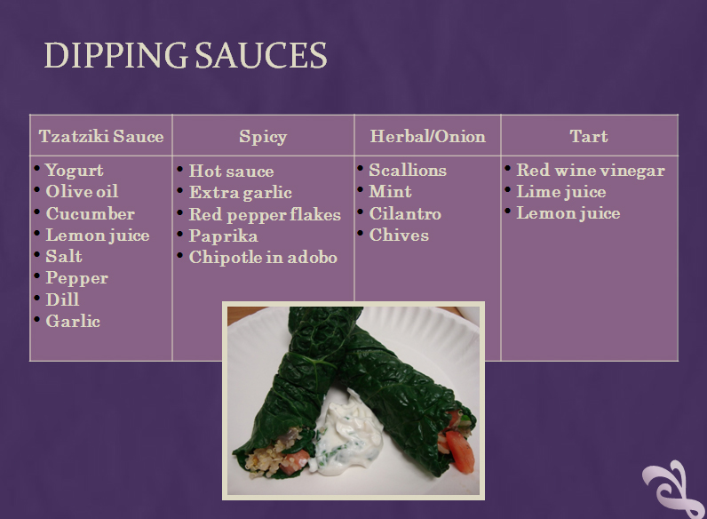 Both of these recipes are vegan. If you are a vegetarian, I do recommend a low-fat Greek yogurt dip for the rolls to increase the protein and calorie content of this meal. Here are some suggestions for flavoring the yogurt to make a yummy dipping sauce. Click to see the image larger in a new window.
