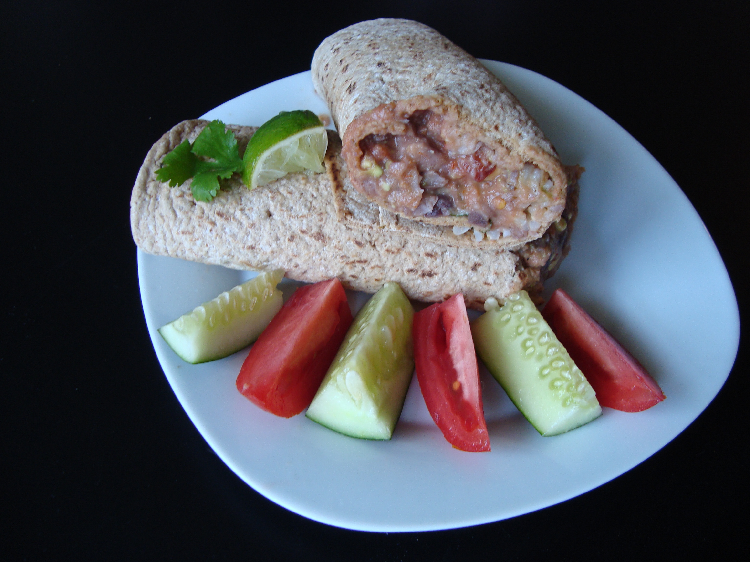 Lunch: bean burrito made from a Flatout wrap, mashed black/pinto beans, salsa, avocado, rice, cilantro, and lime juice served with tomato and cumumber slices on the side