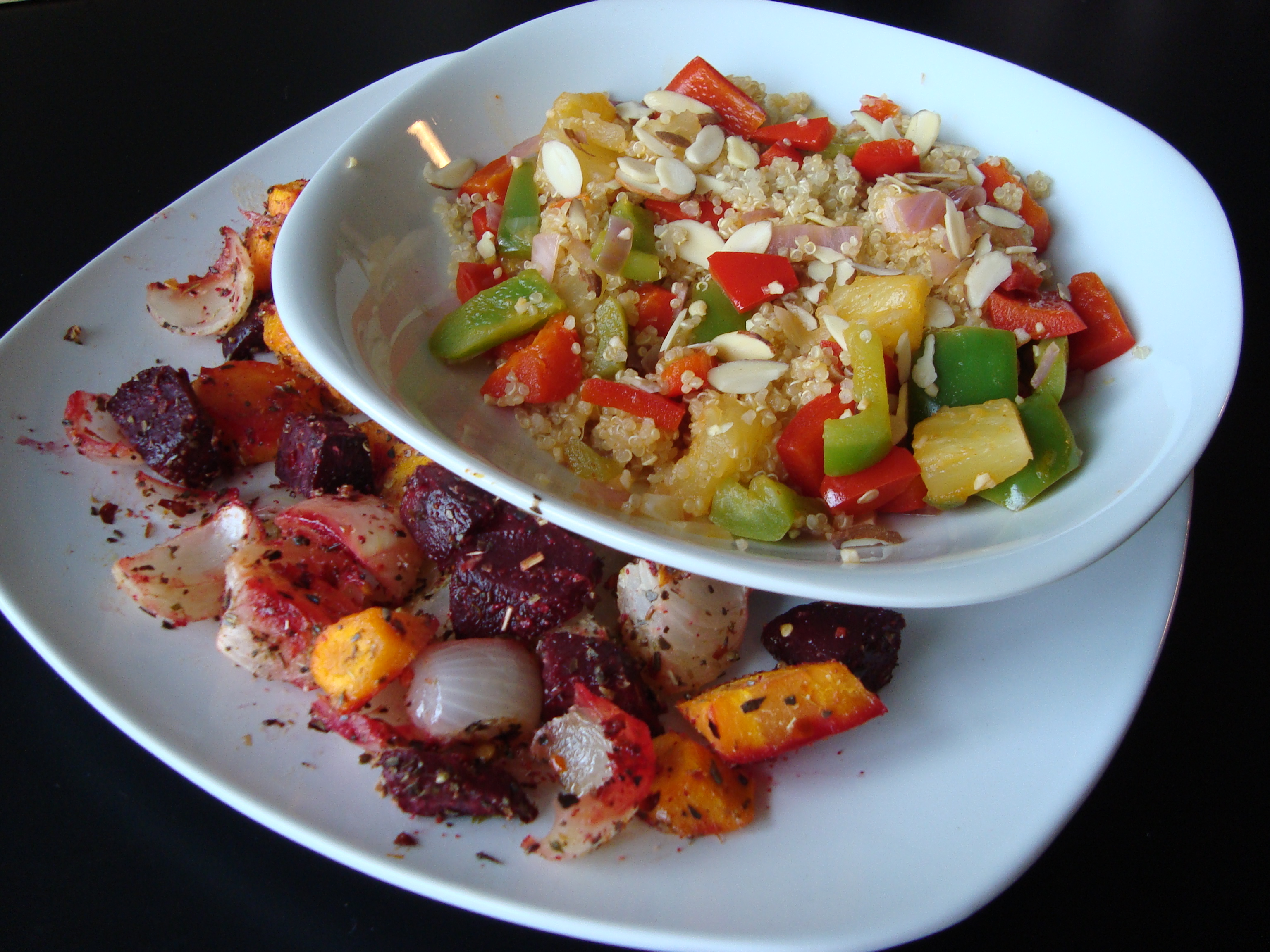 Dinner: Quinoa with red/green bell peppers, red onions, garlic, pineapple, sliced almonds, and a dash of sriracha sauce served with a side of roasted vegetables (beets, carrots, onions) seasoned with canola oil, garlic powder, oregano, and red pepper flakes